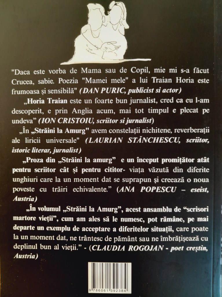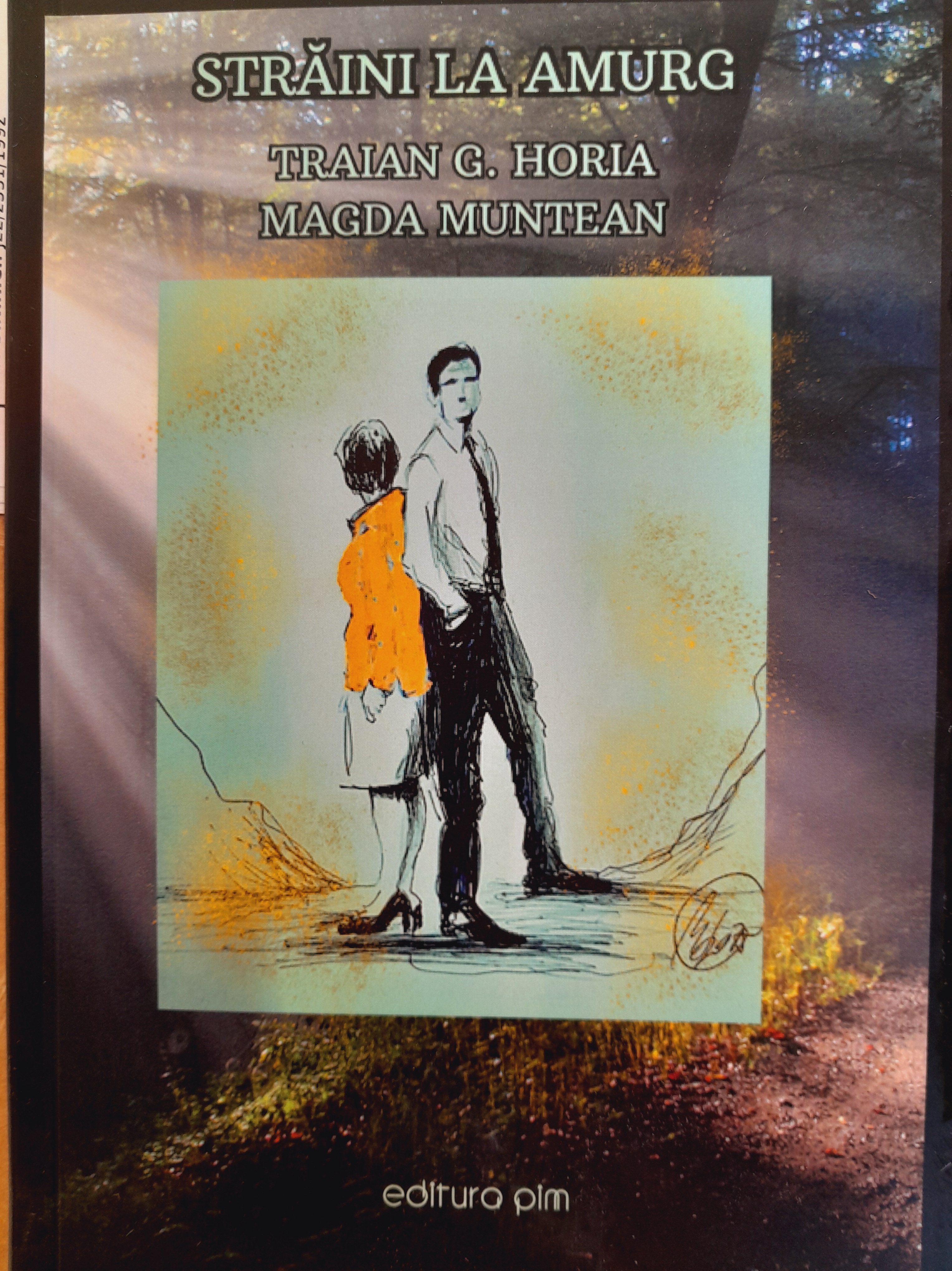 Două gânduri, un amurg… „Străini la amurg” nu este o carte oarecare ci o punte invizibilă aruncată între doi oameni întâlniți din întâmplare, prin contribuția acelei părți a haosului care ordonează astfel de interacțiuni: întâlnirea, ca eveniment imposibil dar obiectiv în necesitatea sa, nu are nevoie doar de legile fizicii în demonstrații, ci si de principiile abstracte ale Artelor, iar cartea se constituie ca dovadă deplină că autorii Traian Horia și Magda Muntean sunt martori ai unui teribil eveniment în progres: au hotărât eventual să transmită prin poezie, grafică și proză scurtă, ceea ce-i unește și ceea ce-i separă, iar lucrurile ce-i dezbină sau unește nu pot fi străine restului comunității.