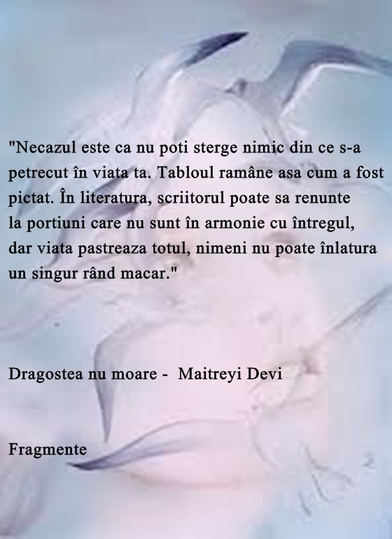 Am descoperit orizontul larg al unei noi vieți, al unui nou început? Nu. Sunt tot atât de crispata în neputința mea de a ma detasa de toate ca si până acum. Sunt tot cea de ieri si de mâine, aceeași femeie care a învățat sa trăiască cu gândul în alta parte, cu dragostea păstrata ca o taina a sufletului ei.